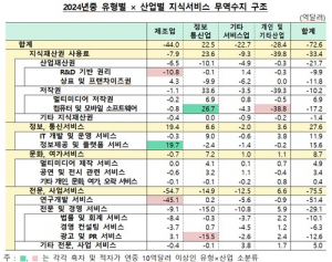 한국은행은 작년 우리나라 지식서비스 무역이 72억6천억달러 적자를 냈다고 밝혔다.한은은 국제수지 부속통계로서 지식서비스 무역통계를 신규 개발해 최초로 공표했다.한국은행은 19일 '우리나라의 지식서비스 무역통계 편제 결과(2010~2024년)'를 통해 작년 중 우리나라 지식서비스 수출은 368억2천만달러, 수입은 440억8천만달러로 나타나 총 72억6천만달러 적자를 나타냈다고 밝혔다.세부 유형별로 정보·통신서비스(27.6억달러) 및 문화·여가서비스(8.7억달러)에서 흑자를 나타낸 반면, 지식재산권 사용료(-33.4억달러) 및 전문·