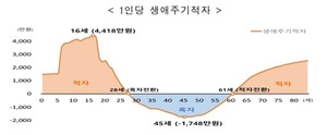 국민 1인당 생애주기에서 28부터 60세까지 33년간만 흑자를 기록하는 것으로 나타났다.16세 때 4천418만원 최대 적자를 기록하고, 45살에 1천748만원 최대 흑자를 내는 것으로 관측됐다.통계청은 25일 이러한 내용을 담은 '2023년 국민이전계정'을 발표했다.국민이전계정은 소비와 노동소득의 관계를 연령 변화에 초점을 두고 연령집단(세대) 간 경제적 자원의 흐름을 파악하는 통계다.지난 2023년 기준 우리나라 국민의 총소비는 1천459조2천억원, 노동소득은 1천232조8천억원으로 집계됐다.소비와 노동소득의 차액인 생애주기 적