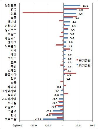 뉴질랜드(+11.6bp)가 조사대상 국가 중 가장 큰 상승폭을 기록했으며, 포르투갈(-13.8bp)의 장기금리는 가장 크게 하락했다.
