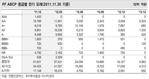 신환종 우리투자증권 크레디트애널리스트는 14일 '부동산 금융' 보고서에서, "12월 한 달 동안 5조1천억원, 2012년 1분기에만 5조7천억원의 PF ABCP 만기도래물량이 몰려 있어 단기상환부담이 상당히 큰 수준"이라고 진단했다.