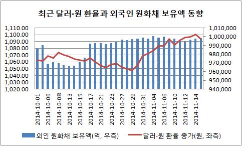 이달 14일과 17일은 모두 달러-원 환율이 1,00원대에 육박하거나 이를 넘었다. 단기적으로 원화가치가 저점으로 인식됐을 때다. 미국 연방준비제도(Fed)의 양적완화 종료가 결정됐고 금통위 이후 국내 추가 기준금리 인하에 대한 기대가 약화했지만, 환차익이나 포트폴리오 다변화를 노린 투자를 지속했다고 해석할 수 있는 부분이다.
