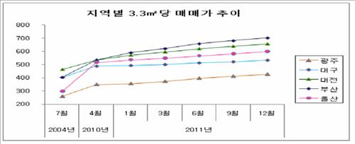부동산포털 부동산써브는 수도권을 제외한 지방 5대 광역시(광주·대구·대전·부산·울산) 143만8천701가구를 대상으로 3.3㎡당 매매가를 조사한 결과, 사상 최고치인 600만원으로 조사됐다고 15일 발표했다.