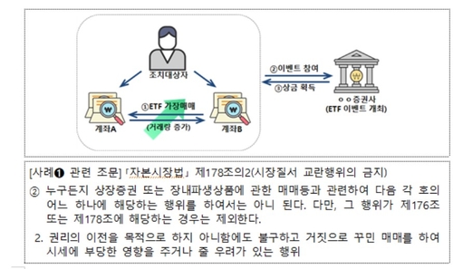 올해 초 과징금이 부과된 사례를 보면 증권사 상장지수펀드(ETF) 이벤트에 참여해 상금 취득 목적으로 가장 매매하거나(설명 1), 주식 선물의 매도·매수 가격 차이를 이용한 이익 획득 과정에서 반복적인 허수 주문을 제출하는 등이 해당된다.