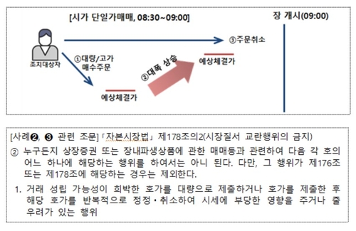 또 시가 단일가 매매 시간인 8시 30분에서 9시 사이에 대량으로 고가의 허수 주문을 반복하는 경우(설명 2)도 과징금 제재 대상이 됐다.