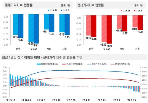 서울(-0.11%)은 대출금리 상승에 따른 이자 부담으로 반전세·월세를 찾는 임차인이 늘면서 지난주 대비 낙폭이 0.02%포인트(p) 확대됐다.
