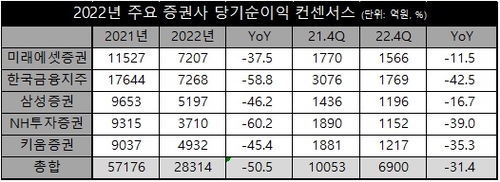 (서울=연합인포맥스) 송하린 기자 = 올해 증권사들은 지난해보다 절반가량 줄어든 실적을 받아들 것으로 전망된다.