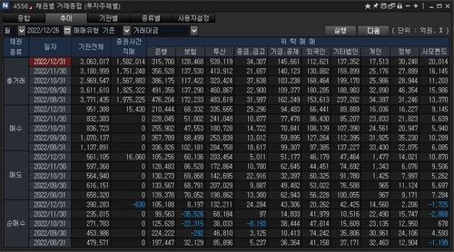 27일 연합인포맥스의 투자주체별 채권 거래종합 화면(화면번호 4556번)에 따르면 연기금(기금·공제)은 이달 들어 26일까지 장외시장에서 채권을 4조2천818억원어치 순매수한 것으로 집계됐다. 금융채를 1조5천328억원어치 순매수하며 가장 많이 매입했고 국고채도 1조원 넘게 담았다.