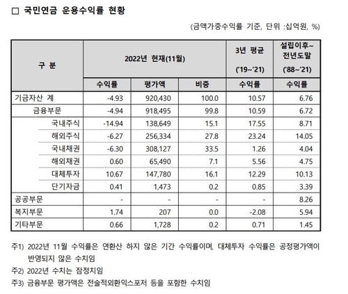 (서울=연합인포맥스) 진정호 기자 = 국민연금공단 기금운용본부가 지난해 들어 11월까지 누적 수익률로 -4.93%를 기록했다. 작년 10월까지 누적 수익률 -5.29%와 비교해 소폭 개선된 수치다.