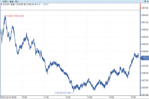 장 초반 코스피는 2,453선까지 회복하다 정오 무렵 2,422선까지 밀렸다.