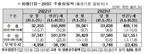 (세종=연합인포맥스) 최욱 기자 = 올해 10월 들어 20일까지 수출이 지난해 같은 기간보다 5% 가까이 증가했다.