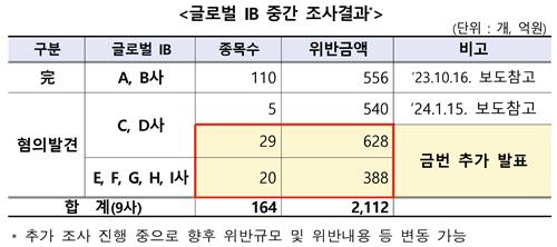 금감원 관계자는 "현재까지 위반이 확인된 글로벌 IB에 대해선 추가 조사가 완료되는 대로 제재 절차에 착수할 것"이라며 "나머지 IB에 대한 조사도 신속히 마무리하겠다"고 강조했다.