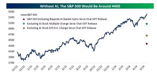비스포크는 "달리 말하면 다른 조건들이 동일했을 때 AI 관련주의 주가 상승이 없었다면 S&P500지수는 현재 지수보다 약 19% 낮은 4,370 주변에 머물렀을 것이라는 추산이 가능하다"고 주장했다.