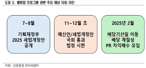 박 연구원은 기획재정부가 세법 개정안을 발표하는 7~8월, 실제 내년도 예산안과 세법개정안이 통과될 것으로 예상되는 11~12월 밸류업 모멘텀이 재차 강화될 것으로 내다봤다.