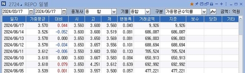 17일 채권시장과 연합인포맥스 레포금리 일별(화면번호 2724)에 따르면 레포 금리는 전 거래일 3.526%를 나타냈다.