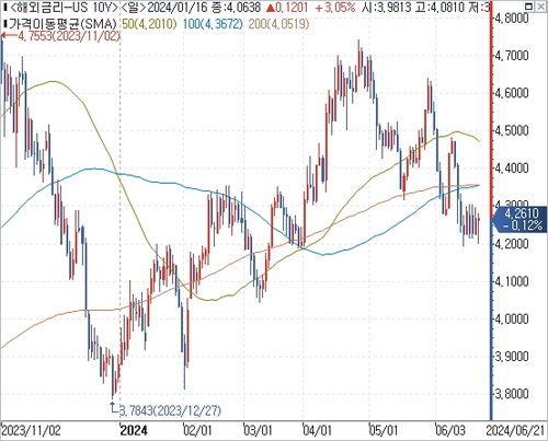 연합인포맥스 해외금리(화면번호 6533)에 따르면 지난 21일(이하 현지시간) 10년 만기 미 국채 수익률은 전주대비 3.50bp 오른 4.2610%를 나타냈다. 3주 만에 처음으로 상승했다.