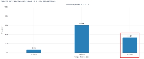 시카고상품거래소(CME) 페드워치에 따르면 연방기금금리(FFR) 선물시장에서 연준이 9월까지 금리를 동결할 가능성은 33.2%로 집계됐다. 한 주 전에는 29.8%였다.