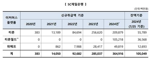 SC제일은행은 올해 티몬 판매자들에게 총 2천98억7천900만원, 티몬월드에 총 1천52억1천800만원, 위메프에는 총 498억1천900만원을 대출했다.
