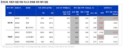 특히 이익 개선 상위 종목 중 반도체와 자동차 업종에 대한 헤지 수단이 주목된다. 특정 업종의 하방 리스크를 헤지할 수 있는 타 종목 편입을 위해선 양 선택지 간 상관관계를 면밀히 고려해야 한다.