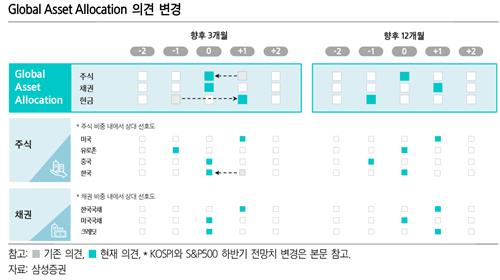 (서울=연합인포맥스) 박형규 기자 = 삼성증권이 단기(3개월) 주식 비중에 대한 의견을 중립으로 변경했다. 현금 보유는 2단계 상향한 확대 의견을 제시했다.