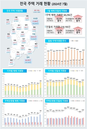 전국 주택 매매도 6만8천296건으로 1년 전보다 41.8% 증가했고 7월 누계로는 17.4% 늘어난 37만9천47건이었다.