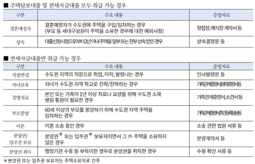 이 외에도 수도권 지역으로 직장이 변경된 경우, 자녀가 수도권 지역으로 진학하거나 전학한 경우, 본인 또는 가족이 1년 이상 치료나 요양을 위해 수도권 소재 병원 통원이 필요한 경우, 60세 이상 부모를 봉양하기 위해 수도권 지역을 임차하는 경우, 이혼 소송 중인 경우 등에도 관련 증빙 자료를 내면 유주택자의 전세자금대출도 가능하다고 밝혔다.