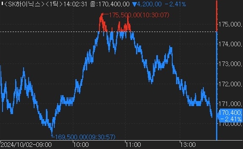 SK하이닉스의 하락 폭은 더 크다. SK하이닉스는 1.89% 내린 17만1천300원에 거래되고 있다. 장중 16만9천500원까지 내린 뒤 하락 폭을 약간 줄여서 거래되고 있다.