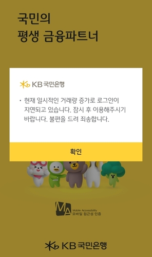 (서울=연합인포맥스) 이현정 기자 = KB국민은행의 모바일 뱅킹 애플리케이션(앱) 'KB스타뱅킹'에서 접속 장애가 발생했다.