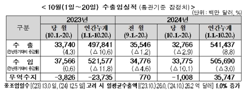 (세종=연합인포맥스) 최욱 기자 = 올해 10월 들어 20일까지 수출이 지난해 같은 기간보다 3% 가까이 감소했다.