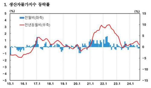 한국은행이 22일 발표한 '2024년 9월 생산자물가지수'에 따르면 지난달 생산자물가지수는 전월 대비 0.2% 하락했다. 지난 8월에 이어 2개월 연속 하락세를 나타냈다.