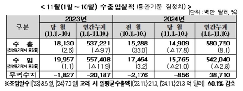 (세종=연합인포맥스) 박준형 기자 = 올해 11월 1일부터 10일까지 수출이 1년 전보다 17.8% 감소했다.