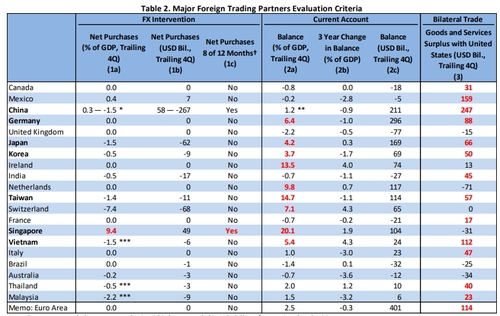 중국의 경우 대미 무역 흑자(2천470억달러) 한 가지 기준만을 초과했지만, 대미 무역수지 흑자가 매우 크고, 외환시장 개입 정보를 공개하지 않은 점 등이 문제로 지목됐다. 위안화 기준환율 산정과 국영은행들의 시장 활동에 있어서의 문제점을 구체적으로 지적하는 등 전반적으로 중국에 대한 견제 밀도가 강화됐다. 6월 보고서에 이어 중국의 외환시장 개입 여부 미발표와 환율 메커니즘에 대한 투명성 부족 등의 문제를 다시 거론하면서 이런 요인들이 계속해서 중국을 정상적 범주에서 벗어난 '열외자(Outlier)'로 머물게 한다고 지적했다.