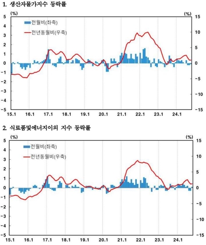 한국은행이 20일 발표한 '2024년 10월 생산자물가지수(잠정)'에 따르면 지난달 생산자물가지수는 전월 대비 0.1% 하락했다. 8월(-0.2%), 9월(-0.2%)에 이어 3개월 연속 하락세다.