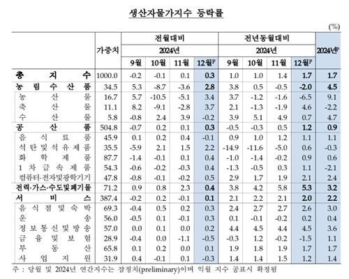 연간 기준으로 2024년 생산자물가는 전년 대비 1.7% 상승한 것으로 집계됐다.