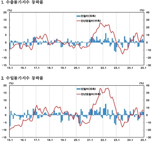 한국은행이 14일 발표한 '2025년 1월 수출입물가지수 및 무역지수(잠정)'에 따르면 1월 원화 기준 수입물가지수는 전월 대비 2.3% 상승했다. 전년 동월과 비교하면 6.6% 올랐다.
