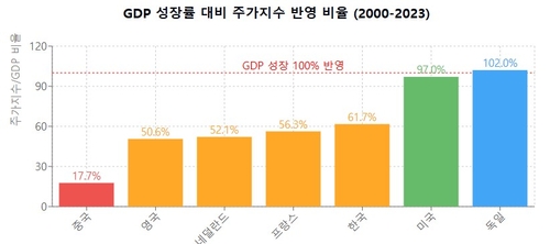 6일 연합인포맥스가 2000년부터 2023년까지 주요국의 명목 국내총생산(GDP) 성장률과 주가지수 데이터를 분석한 결과 중국을 비롯해 영국, 네덜란드, 프랑스 모두 한국보다 GDP와 주가지수 간 괴리가 더 컸으며 미국과 독일만이 의미 있는 동조성을 보였다.