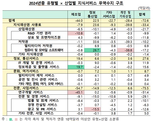 세부 유형별로 정보·통신서비스(27.6억달러) 및 문화·여가서비스(8.7억달러)에서 흑자를 나타낸 반면, 지식재산권 사용료(-33.4억달러) 및 전문·사업서비스(-75.5억달러)에서는 적자를 기록했다.