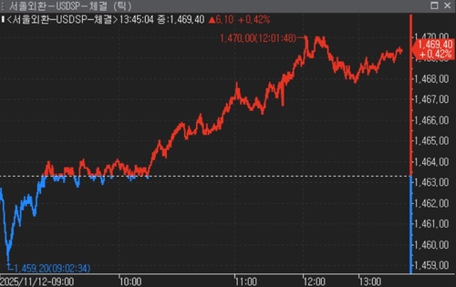 12일 서울 외환시장에서 달러-원 환율은 오후 1시45분 현재 전장대비 6.10원 오른 1,469.40원에 거래됐다.