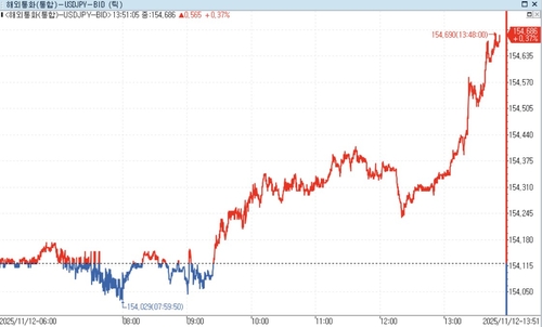 12일 연합인포맥스(화면번호 6411)에 따르면 달러-엔 환율은 오후 1시50분 현재 전일 대비 0.37% 상승한 154.686엔을 기록했다.