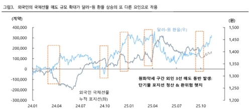 박상현 iM증권 연구원은 "주식시장에서도 차익실현 차원에서 이달 들어 외국인의 주식 순매도 규모가 확대되고 있는 상황에서 채권시장에서 외국인이 선물시장을 중심으로 매도세를 강화한 것이 환율 상승을 촉발하고 있다"며 "외국인 국채선물 매도가 환율 상승으로 이어지고, 환율 상승이 다시 외국인 국채 선물 매도를 유발하는 악순환 현상마저 일부 현실화하고 있다"고 우려했다.