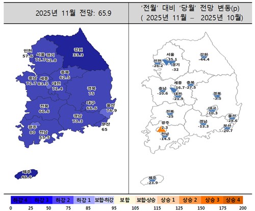 비수도권 역시 66.3(18.5p↓)으로 하강국면에 접어들었다. 광역시는 73.8(16.0p↓), 도지역은 60.7(20.3p↓)로 전망됐다.