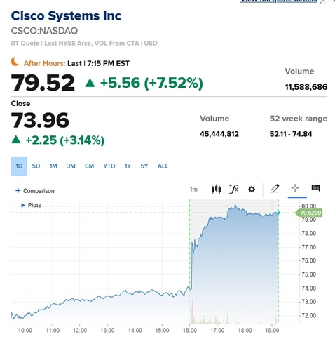 시스코 시스템즈는 시간외 거래에서 정규장 대비 5.56달러(7.52%) 오른 79.52달러에 거래됐다.