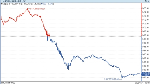 14일 서울 외환시장에서 달러-원 환율은 오전 9시 33분 현재 전장대비 10.20원 내린 1.457.50원에 거래됐다.