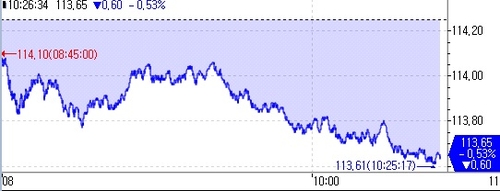 (서울=연합인포맥스) 오진우 기자 = 10년 국채선물이 14일 오전 장에서 전일대비 60틱 이상 가파른 약세를 나타내고 있다.