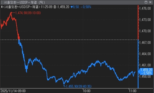 14일 서울 외환시장에서 달러-원 환율은 오전 11시26분 현재 전장대비 8.50원 하락한 1,459.20원에 거래됐다.