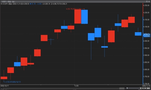 14일 오후 1시 46분 현재 코스피는 전 거래일보다 129.03포인트(3.09%) 내린 4,041.60을 기록 중이다.