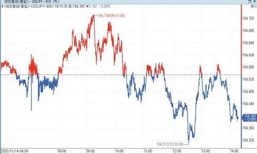 연합인포맥스(화면번호 6411)에 따르면 달러-엔 환율은 오후 2시15분 현재 전일 대비 0.09% 하락한 154.393엔을 기록했다.