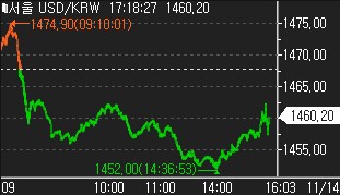 14일 외환시장에서 달러-원 환율은 오후 5시 18분 현재 전장 대비 7.30원 하락한 1,460.20원에 거래됐다.