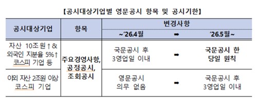 공시 기한도 줄인다. 10조원 이상 코스피 상장사는 국문 공시 제출 당일 영문 공시를 제출해야 하며, 2조원 이상 상장사는 3영업일 내 공시해야 한다.