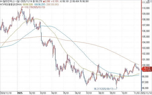 연합인포맥스의 달러인덱스 및 이종통화 등락률 비교(화면번호 6400번, 6443번)에 따르면, 지난 14일(이하 현지시간) 기준 주요 6개국 통화에 대한 달러화 가치를 나타내는 달러인덱스(DXY)는 전주대비 0.273포인트(0.27%) 낮은 99.279에 거래를 끝냈다.