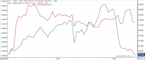 17일 연합인포맥스 종합차트(화면번호 5000)에 따르면 쿠팡 주가는 지난 4일(현지시간) 3분기 실적을 발표한 후 지난 14일까지 12.2% 하락했다. 이에 따라 쿠팡 주가는 28.22달러로 장을 마감했다. 이 기간 미국 S&P500 지수는 0.6% 하락했다.